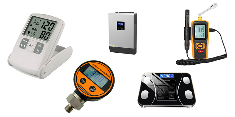 산업용 기기 및 측정 장비: 멀티미터, 온도계, 습도계, 압력계, 유량계.